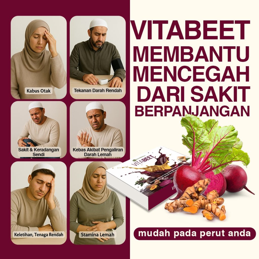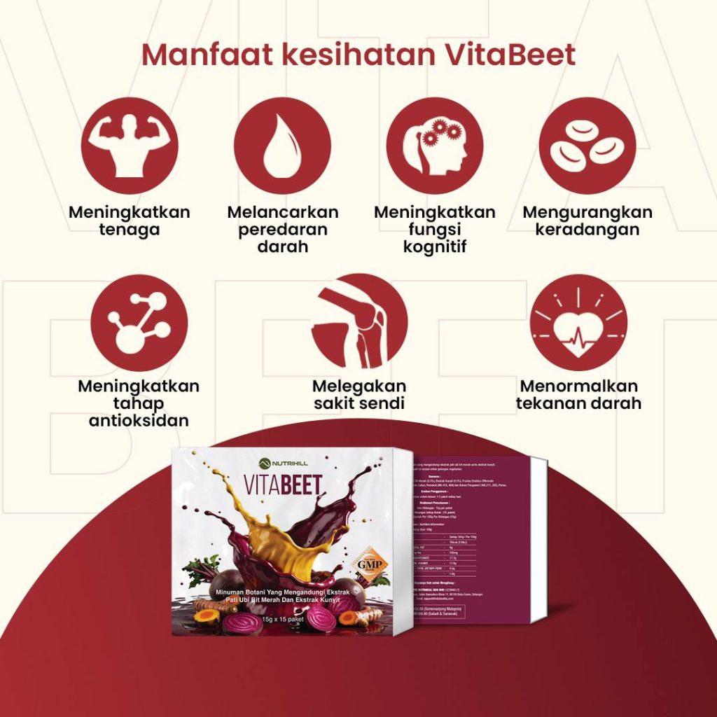 VitaBeet bukan sekadar jus biasa. Ia diformulasikan dengan gabungan 4 ekstrak superfood klinikal, Vita Beet bukan sekadar minuman kesihatan biasa. Ia bertindak dari akar masalah iaitu melancarkan peredaran darah, aktifkan nitrik oksida, dan bantu kurangkan tekanan darah & keradangan sendi secara semula jadi.